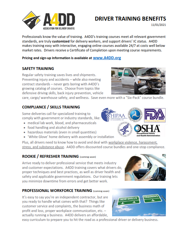 - Sample Driver Signup Guide for insurance benefits (register with A4DD to receive your own)