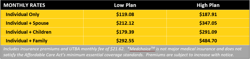 Our low-cost Medchoice™ plan rates are shown below. The Medchoice™ Brochure shows the benefits for each plan. Payment is monthly on the 15th of the month.