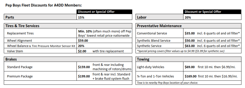 Save at Pep Boys’ 1000+ locations nationwide for complete vehicle care. Click below to get your A4DD member discount certificate. Present it at any Pep Boys location and pay the same discounted rates as the big fleets. See the chart below for details.